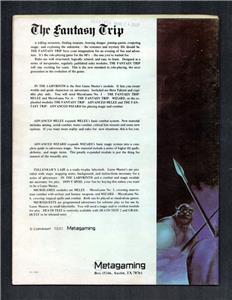 Advanced Melee (32 pages, Metagaming #2103, copyright 1980) soft cover is complete with the maps still bound in and is in excellent condition. The interior pages are in unmarked high level excellent condition as there are only minor flaws such as tiny amounts of creasing at the right corner tips along with slight aging. The covers are in excellent condition as there are slight flaws, though the striking cover art retains most of its original appeal (see SuperSize Pictures). All pages including the maps are firmly attached. An excellent opportunity to pick up the three essential books to The Fanstasy Trip as Advanced Melee, Advanced Wizard, and In the Labyrinth were all in stock when this was listed!