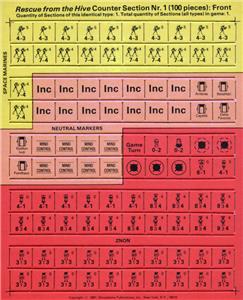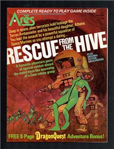 The Fine MegaExtras in our Rescue from the Hive WebGuide (to be emailed) include the official solitaire rules (from Moves Magazine #56), several videos (an instructional video and several game sessions), and two brief game reviews. The Rescue from the Hive WebGuide will be emailed upon shipment of your purchase. In Rescue from the Hive the Znon, humanoid aliens with insectile communal instincts and values, have begun diplomatic talks with the Terrans, but Znon radicals have taken Earth's primary negotiator Ambassador Helstrom and his daughter Athena hostage aboard their Hiveship. In response the Space Marines aboard a small task force of Darter spacecraft have been dispatched to rescue the ambassador and his daughter, before the Znon ship goes into hyperdrive and disappears into Znon Space. A two-player game of below average complexity which can be played solitaire with the rules included in the bonus materials. Also included is an eight-page DragonQuest adventure.