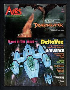 Ares Magazine #9 (the featured game is DeltaVee) is complete with the 200 unpunched counters (nicely-centered on both sides) in new condition. The 11"x17" map has only minor flaws and is in near new condition. The front cover art retains most of its original appeal (See SuperSize Pictures) with only slight to minor flaws such as a series of short creases emanating from the spine and minor creasing from being held. The unmarked rules were printed separately from the magazine and are in excellent condition though the cover has a small portion of the upper right corner torn off and minor general creasing form being held. The interior pages are in high level excellent condition. All pages are firmly attached. An excellent opportunity to pick up other rare issue of Ares (6+ were listed at the same time as this issue) and/or a number of rare science fiction games from our store! Collections of the MegaExtras offered for Ares Magazine are also available!