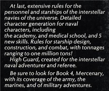 High Guard (52 pages, copyright 1980) has interior pages in new condition with very smooth, unmarked, white pages, with the following exceptions: the form on page 37 has values lightly penciled in, there are sections highlight in light blue on pages 38-41 (more than 20 lines) and page 48 (five lines). The covers are in excellent condition with slight scuffing\wear, slight creasing at the corners, and other slight flaws (see Enlargeable Pictures). The blank inside of the front cover has a price sticker. A great opportunity to save on shipping costs by picking up several Traveller books out of the 35+ listings which were in the Traveller section of our store when this was posted. Please email if there is a GDW Traveller book you would like to see listed. We have most in stock, but it may take quite a while to get to them all. The Traveller MegaExtras included in this listing span over 5,000 pages of Traveller History, Corrections, Errata, Data on the Spinward Marches, and Much More!!! There are over 100 pages alone on important dates in Traveller history along with 1000s of pages of data on the Spinward Marches! Corrections to many of the Classic Traveller books, plus a mammoth amount of errata for other editions, such as MegaTraveller and Traveller New Era, are included. The "much more" includes two outstanding mapping generators of the Traveller Universe (click on an area of interest and increase the magnification to see the local map!), a design-your-own counters utility, and a plethora of ship stats. Great for the beginner and the experienced player with dozens of Traveller adventures (introductory and otherwise) plus handouts to acquaint newcomers with the basics. All of this is accessible from the Traveller WebGuide Version 4.0, which will be emailed upon shipment of your purchase! The trans-spatial organic nature of the WebGuide means the materials will both grow and evolve through time. From the back cover: At last, extensive rules for the personnel and starships of the interstellar navies of the universe. Detailed character generation for naval characters, including academy, and medical school, and 5 new skills. Rules for starship design, construction, and combat, with tonnages ranging to one million tons! High Guard, created for the interstellar naval adventurer and referee.