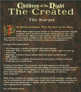 Ravenloft Children of the Night The Created (TSR 11360, copyright 1999, 96 pages) is complete and in new condition with only trivial cover flaws. The interior pages are in new condition. This is one of the first of a dozen Ravenloft listings we hope to post in the near future. Please email if you wish a list. When this listing posted, the D&D\AD&D section of our store included 40+ rare D&D\AD&D adventures and supplements including early Gary Gygax titles, such as the Original (OCE White Box) D&D Rules, Chainmail Rules for Medieval Miniatures, Tomb of Horrors and all three of the original AD&D Rulebooks, Deities & Demigods (both printings with and without Cthulhu), plus one of TSR's earliest publications - Tricolor with a forward by Gary Gygax!
