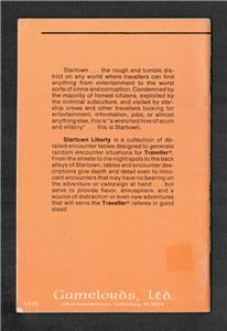 Startown Liberty (Traveller Approved\Gamelords Ltd., 48 pages, 1984) has interior pages in near new condition with smooth, unmarked, glossy pages except for slight dog-earing to the right corners of many of the pages and slight diagonal creasing to much of pages 21 thru 26. The covers are in excellent condition slight but noticeable flaws, that do detract from their appearance (See SuperSize Pictures). The staples are relatively shiny, but are darkening a bit. All pages are firmly attached. A great opportunity to save on shipping costs by picking up several Traveller books and miniatures out of the 55+ listings which were in the Traveller section of our store when this was posted. Please email if there is a GDW Traveller book you would like to see listed. We have most in stock, but it may take quite a while to get to them all. The Traveller MegaExtras included in this listing span over 5,000 pages of Traveller History, Corrections, Errata, Data on the Spinward Marches, and Much More!!! There are over 100 pages alone on important dates in Traveller history along with 1000s of pages of data on the Spinward Marches! Corrections to many of the Classic Traveller books, plus a mammoth amount of errata for other editions, such as MegaTraveller and Traveller New Era, are included. The "much more" includes two outstanding mapping generators of the Traveller Universe (click on an area of interest and increase the magnification to see the local map!), a design-your-own counters utility, and a plethora of ship stats. Great for the beginner and the experienced player with dozens of Traveller adventures (introductory and otherwise) plus handouts to acquaint newcomers with the basics. All of this is accessible from the Traveller WebGuide Version 4.0, which will be emailed upon shipment of your purchase! For shipping this book will be wrapped in plastic and taped between two unbent sheets of extremely sturdy cardboard.