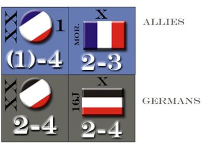 The set includes 150+ beautifully done variant counters for The Marne. See the sample below. These counters provide a complete set for playing the game. The counters are 1/2" size (as are the game's original counters), about the thickness of a standard counter (but not exactly the same), are not die-cut, and will be cut into individual counters prior to shipping. Also included are a few bonus materials which may be of use. All of the non-counter materials may emailed upon shipment of your purchase. The color shades of the actual counters may differ from those seen on your monitor. Variant counters are sent to professional printers to produce a high quality product.